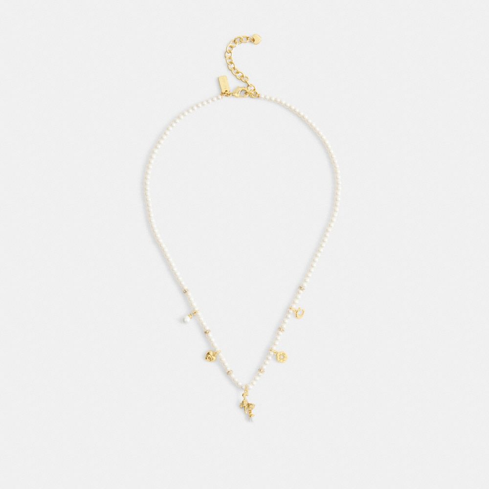 Questa collana in delicate perle di vetro presenta un allegro ciondolo a gattino, circondato da alcuni dei motivi iconici di Coach. Impreziosito da scintillanti cristalli, il gioiello presenta una chiusura regolabile con gancio.