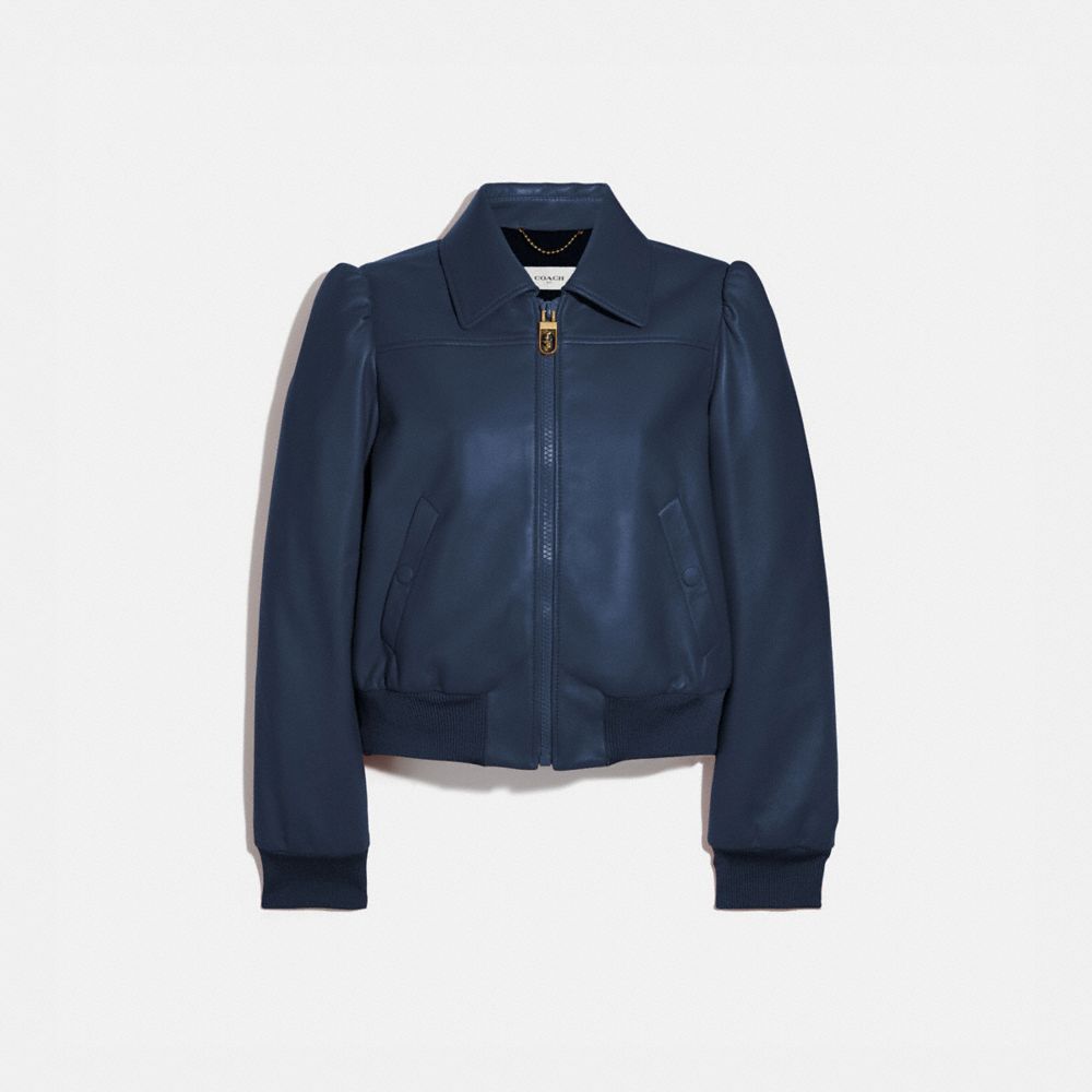 Aggiungi un po’ di volume al classico modello in stile militare, con questa giacca in pelle di agnello morbida e leggera, impreziosita dalle maniche a sbuffo per un tocco di femminilità. Questo giubbotto dalla vestibilità classica è rifinito con un colletto a punta, tasche laterali con chiusura a scatto e bordi lavorati a coste.