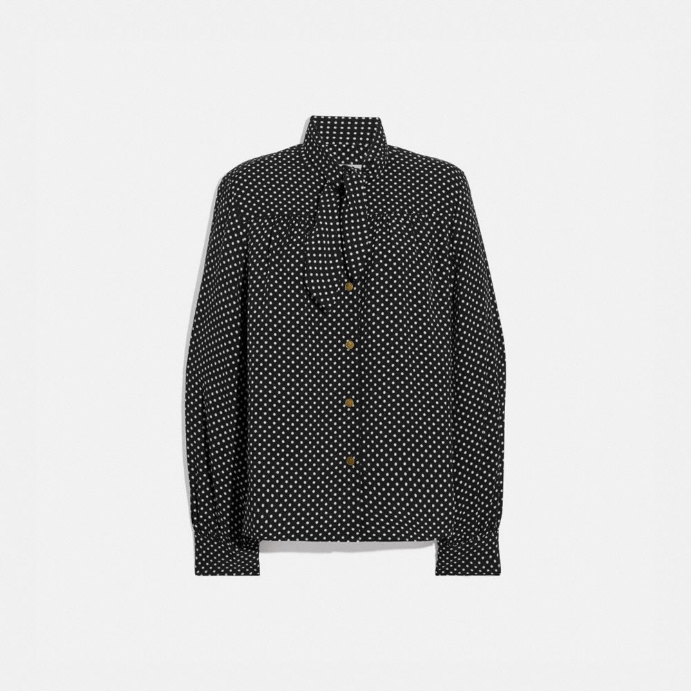 Questa camicetta leggera con vestibilità classica e stampa a pois in stile retrò è rifinita con scialle lungo attaccato al colletto, da tenere slacciato o da annodare al collo. È impreziosita da bottoni lucidi e motivo della carrozza trainata da cavalli.