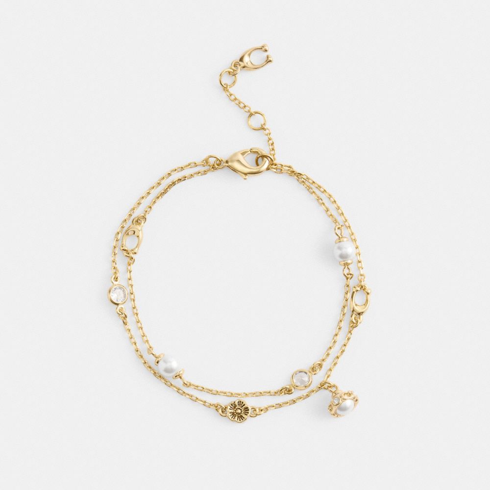 Ideato con un semplice look a strati, questo braccialetto a catena presenta una serie di motivi iconici di Coach insieme a perle di vetro e cristalli scintillanti perfettamente posizionati. È rifinito con una chiusura con fibbia regolabile, per adattarsi alla maggior parte dei polsi.