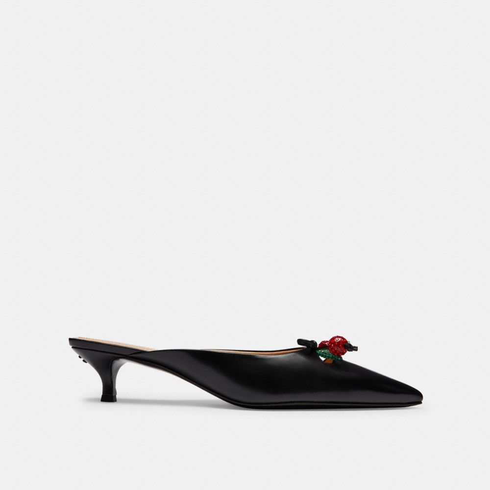 Un modello elegante arricchito da una nota di allegria, questo sabot in pelle è rifinito con un grazioso fiocco impreziosito da ciondoli a ciliegia con scintillanti cristalli. Con una punta sfilata e un tacco a rocchetto scolpito, questo modello slip-on sfoggia un inserto Signature tono su tono per un discreto tocco di tradizione.