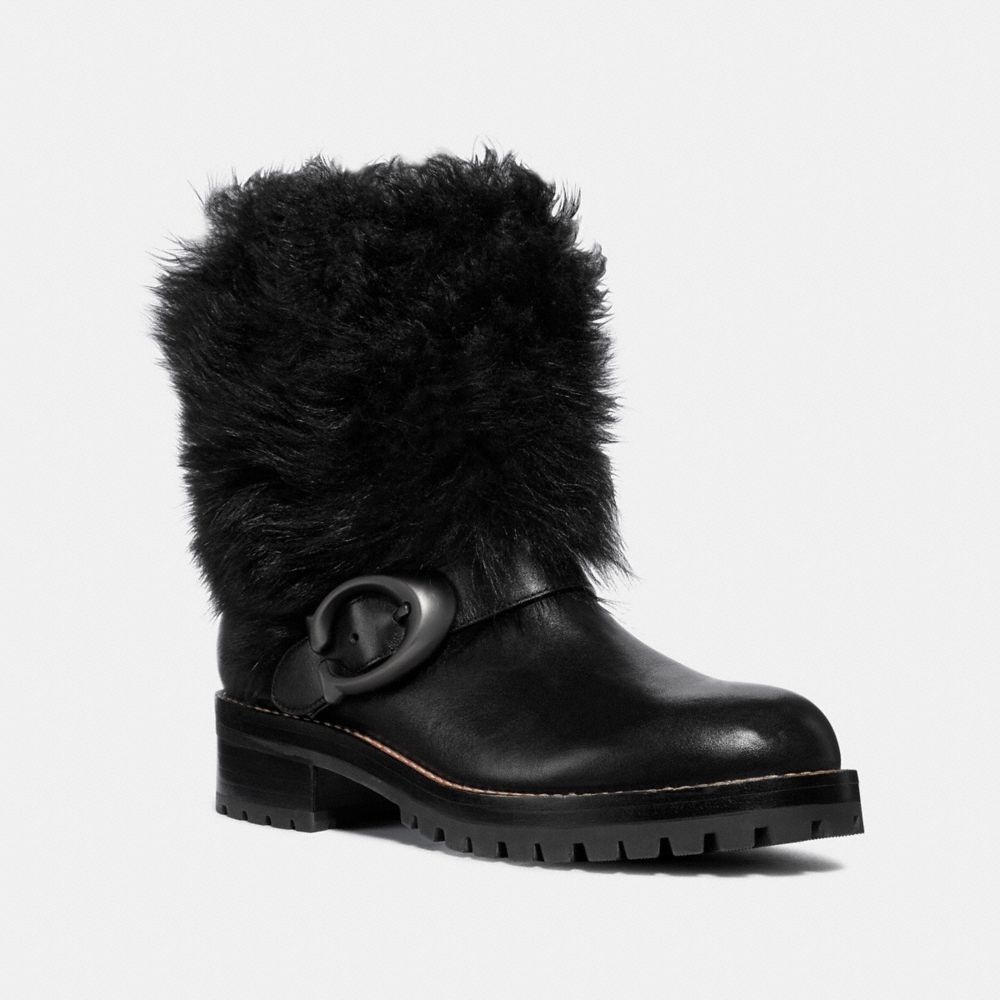 Realizzato in pelle liscia, l’iconico stile da motociclista è riproposto con un risvolto in shearling a pelo lungo e fibbia Signature. Una suola a carrarmato assicura aderenza on the road e durante le passeggiate in città.