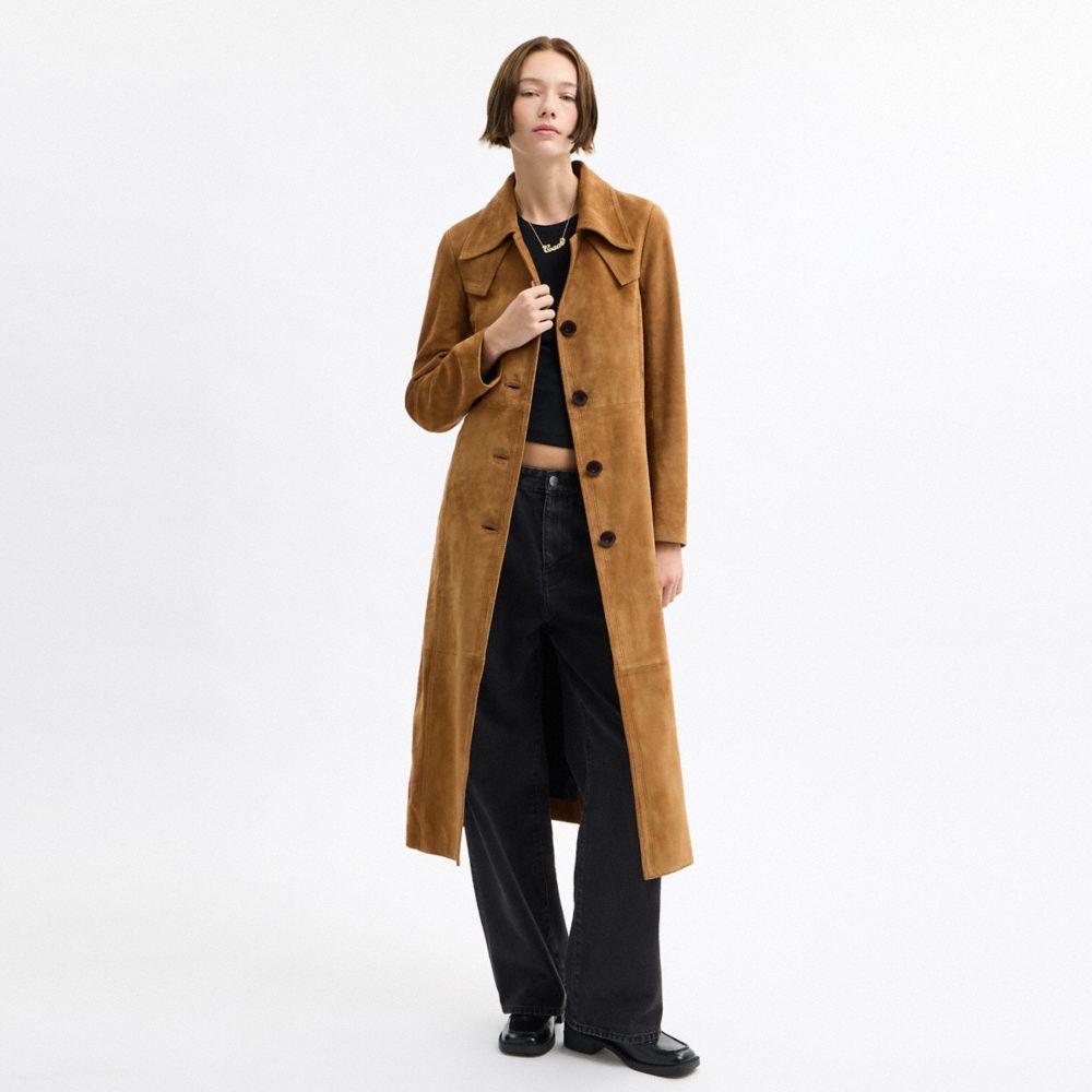 Ispirata ai design esagerati degli anni ’70, questa lussuosa rivisitazione del classico trench è realizzata in morbido e vellutato camoscio. Caratterizzato da un colletto oversize e da una cintura in vita che aiuta a definire la figura, il modello lungo è rifinito con una chiusura con bottoni sul davanti e uno spacco posteriore che agevola i movimenti.