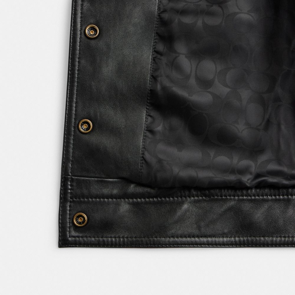 Impreziosita dalle nostre rifiniture lucidate a forma di fibbia, questa giacca accorciata è realizzata in morbidissimo cuoio. Questo modello dal taglio squadrato, leggermente accorciato, è rifinito con un colletto dalla tradizionale forma a punta, da tasche a fessura e da bottoni a scatto.
